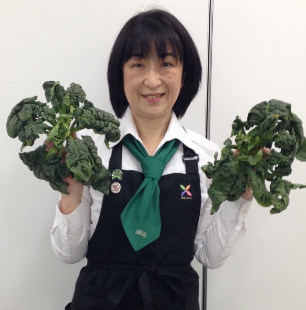 野菜ソムリエスタイルで両手に大好きな縮みホウレンソウを持って記念撮影♪
