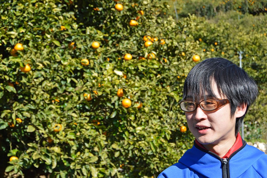 峯村さんの向こう側にあるのが ゆらみかんの木。(奥側)
