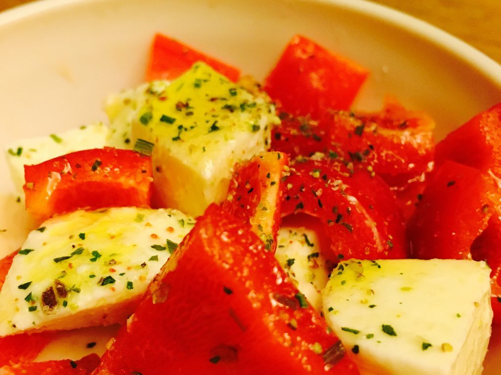 今回は、『赤パプリカのカプレーゼ風』。普通は、カプレーゼといえば、「トマト」と「モッツァレラチーズ」、そして仕上げにバジルの葉をあしらい、イタリアの国旗の色に仕上げていきます….。私、この『カプレーゼ』が大好きなのですが、ある日、いつものように「カプレーゼ、つ〜くろっっ!♪♪」と冷蔵庫を開けると、いつもは必ずのように常備してあるはずの「トマト」がないっっっ!!驚!→嘆き!→悲しみ… でも!気分はもうどうにもカプレーゼ!笑。さてさて、どうしよっかなー。と冷蔵庫の中を覗いたら、あるではないですか!赤いパプリカが!!!ということで、急遽、アレンジした一品です♪