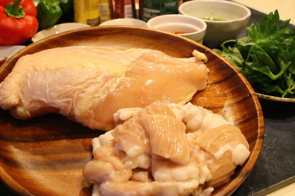 ハネる牛ホルモンの代わりに、色の白い鶏むね肉を使ってみましょう。
