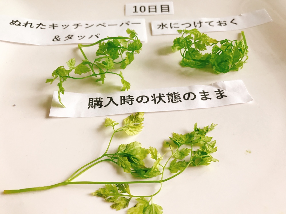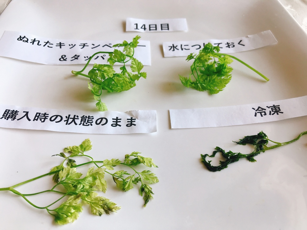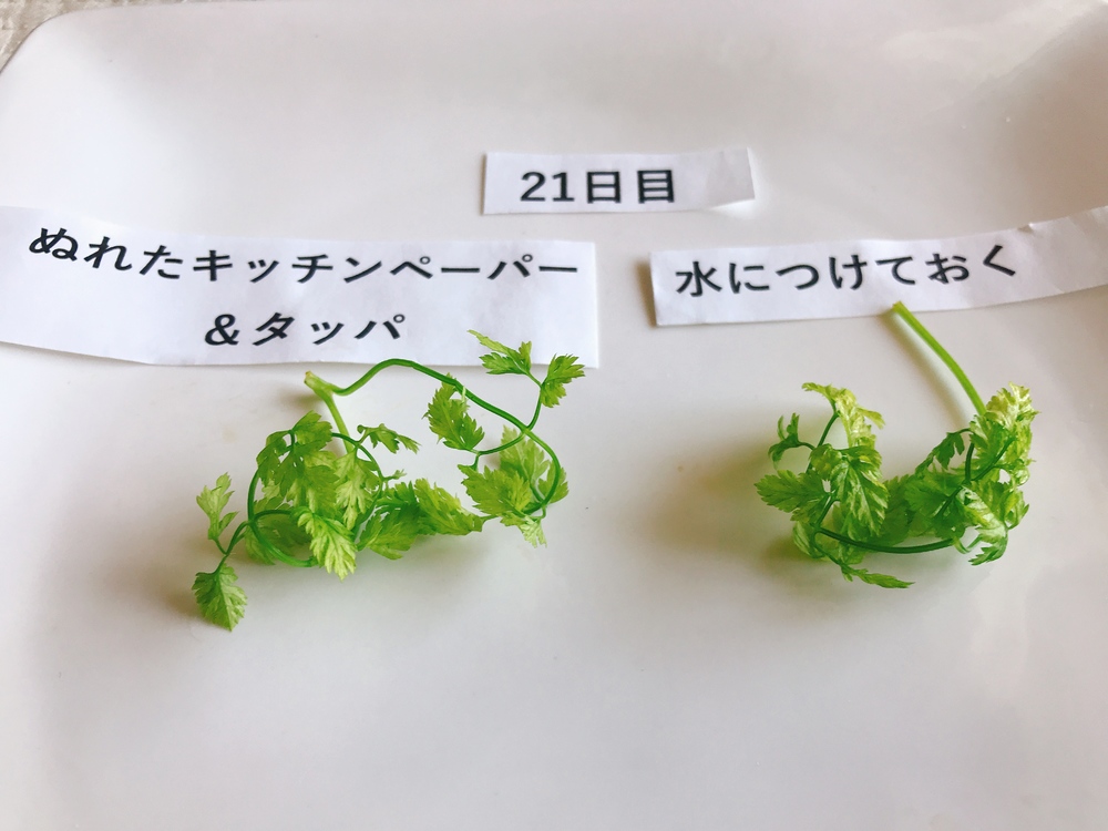 ・チャービル…「濡れキッチンペーパー+タッパ」または「全体を水につけておく」 21日目 でもまだ元気!