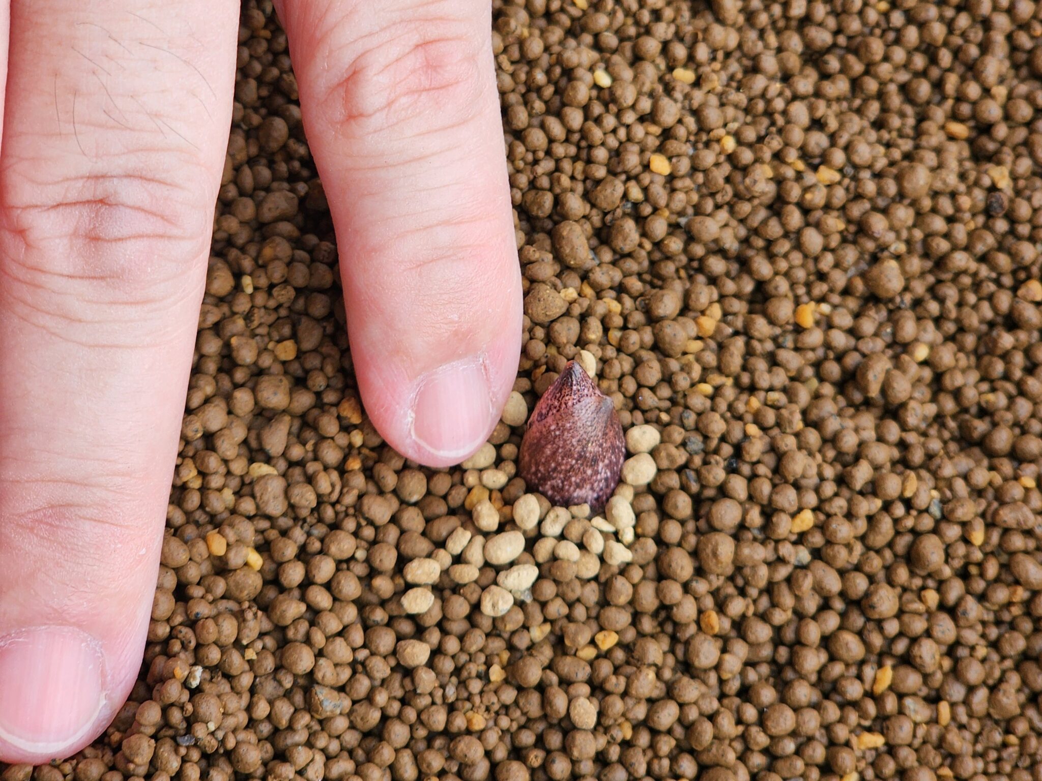 「埋めてから気温は 30 度近い日が続き、3 日に一度ほどたっぷり水やりをして、出芽を心待ちにしていました。1 ヶ月ほどで、プランターの中央やや右寄りにひとつ芽が出てきました。色はややくすんだピンクがかった茶色で、先端が尖った円錐形をしています。表面はつるっとしていますが、土から顔を出したばかりの力強さを感じさせます。