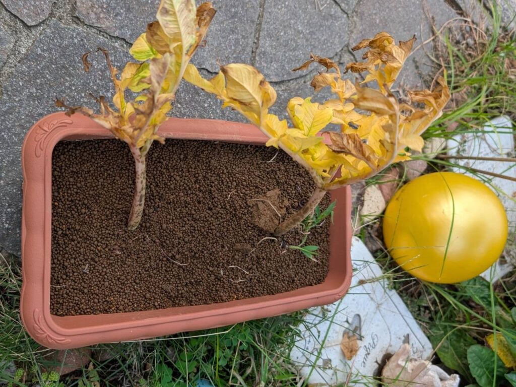 「10月に入り、ベランダのこんにゃく芋がぐっと秋らしく、そして冬支度へと向かっていく様子へと劇的に変化しました。 この時点では、左側の株はまだ葉っぱが鮮やかな黄色をしていました。まるで紅葉のように色づいていて、部分的にまだ緑も残っていたので、「まだもう少し頑張るぞ!」という雰囲気でした。茎もまだしっかり立っていました。 一方、右側の株は、すでに葉っぱが完全に茶色く枯れ、地面に倒れている状態でした。こちらは左の株より一足早く、お仕事を終えていたようです。 開葉した日も背丈も色も違い、同じように猛暑の日光に当たっていたのに片方がより日焼けしてしまったりもあり、同じプランター内なのに同じようには育たないんだな、と感じました。」