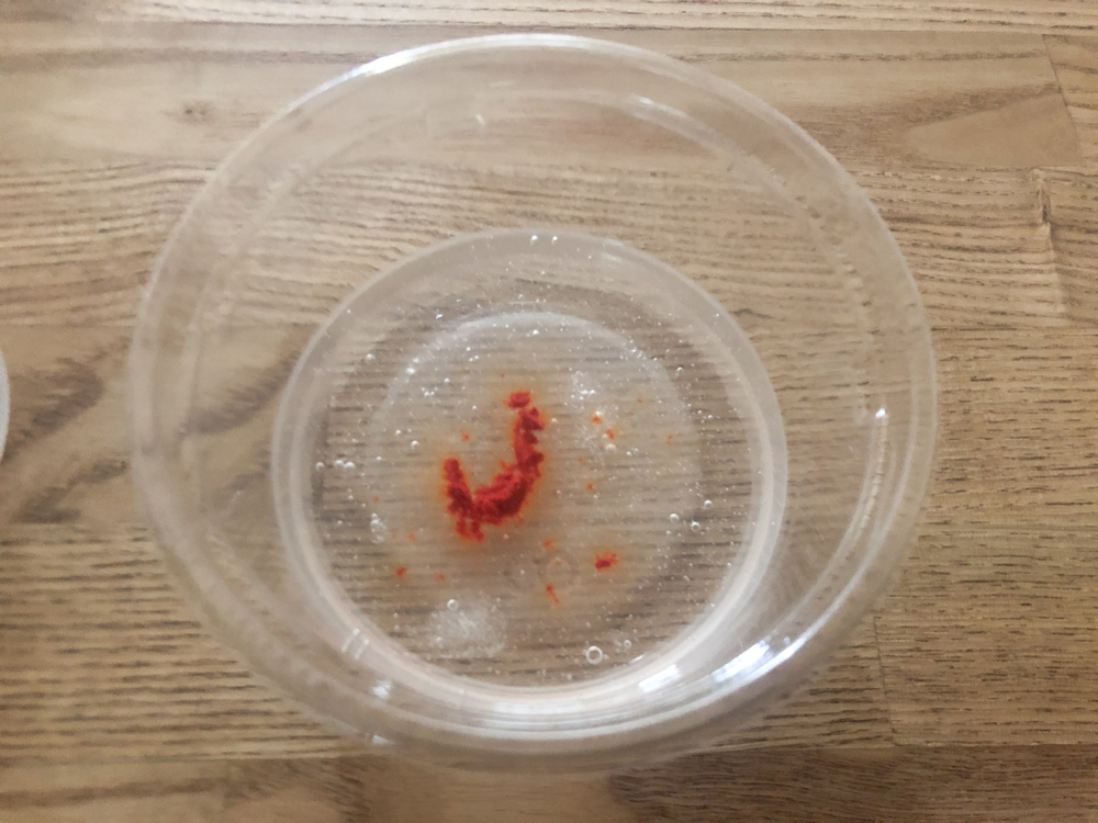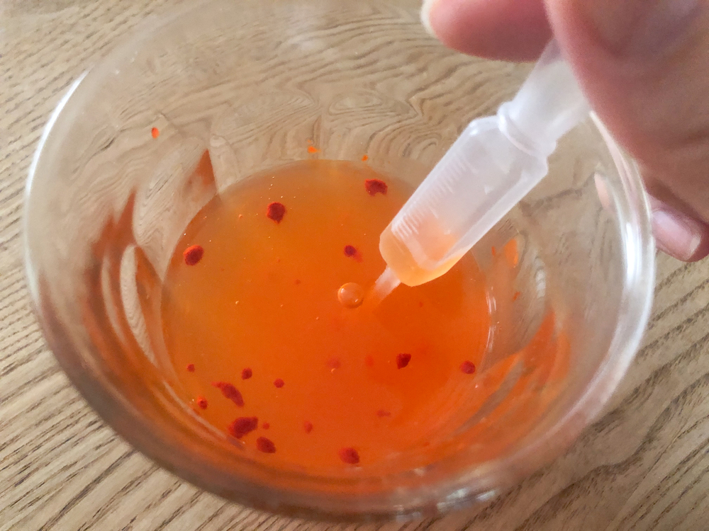 ④スポイトで着色した液をとり乳酸カルシウム液の中に垂らす。