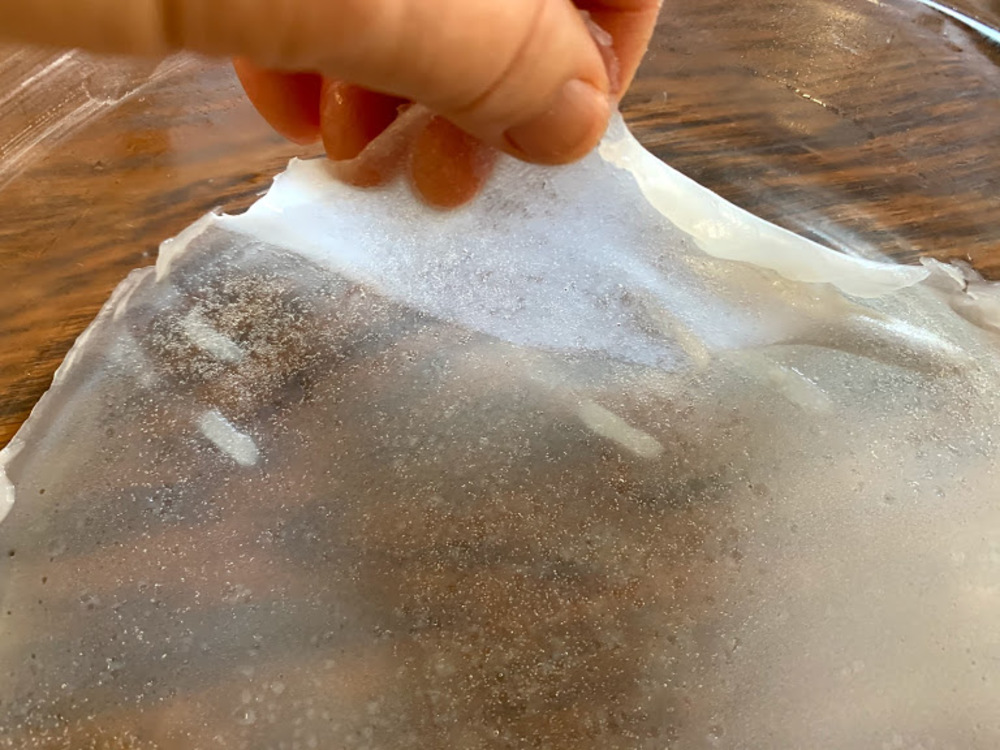⑥ スケッパーなどの道具を使い外側を丁寧にはがす。熱いけれど放置すると乾燥してはがれなくなるので、なるべく早めに。3cmくらいはがしたら手でゆっくりはがしてみよう!