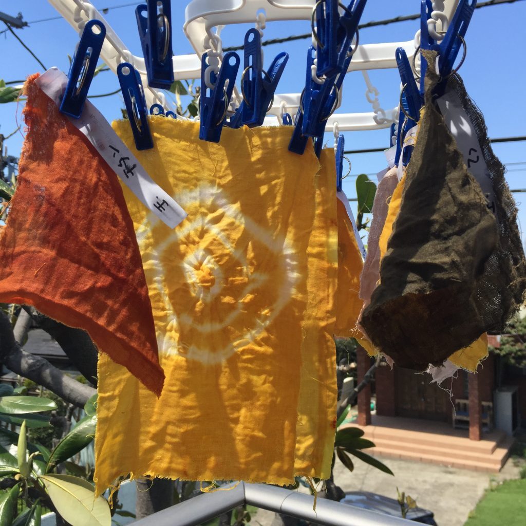 基本の工程では染めた後金属イオンと結びつけて色素を定着させるために媒染液に漬けました。