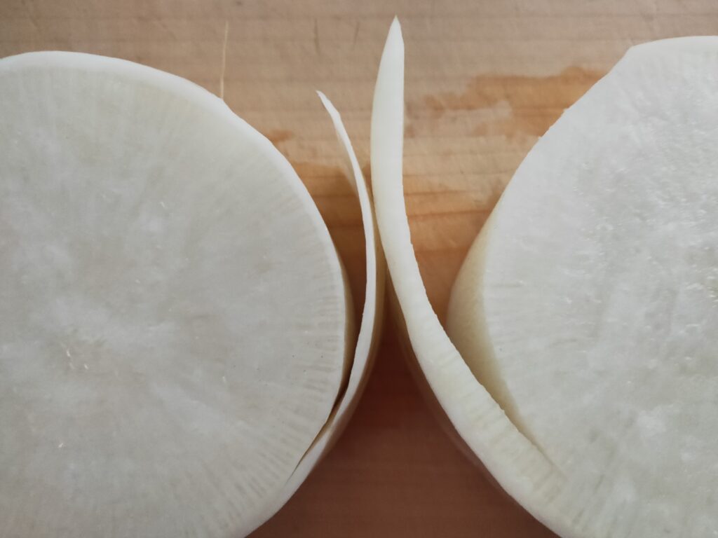 厚めに剥いた大根は、中の方へグラデーションで色が入ってます。