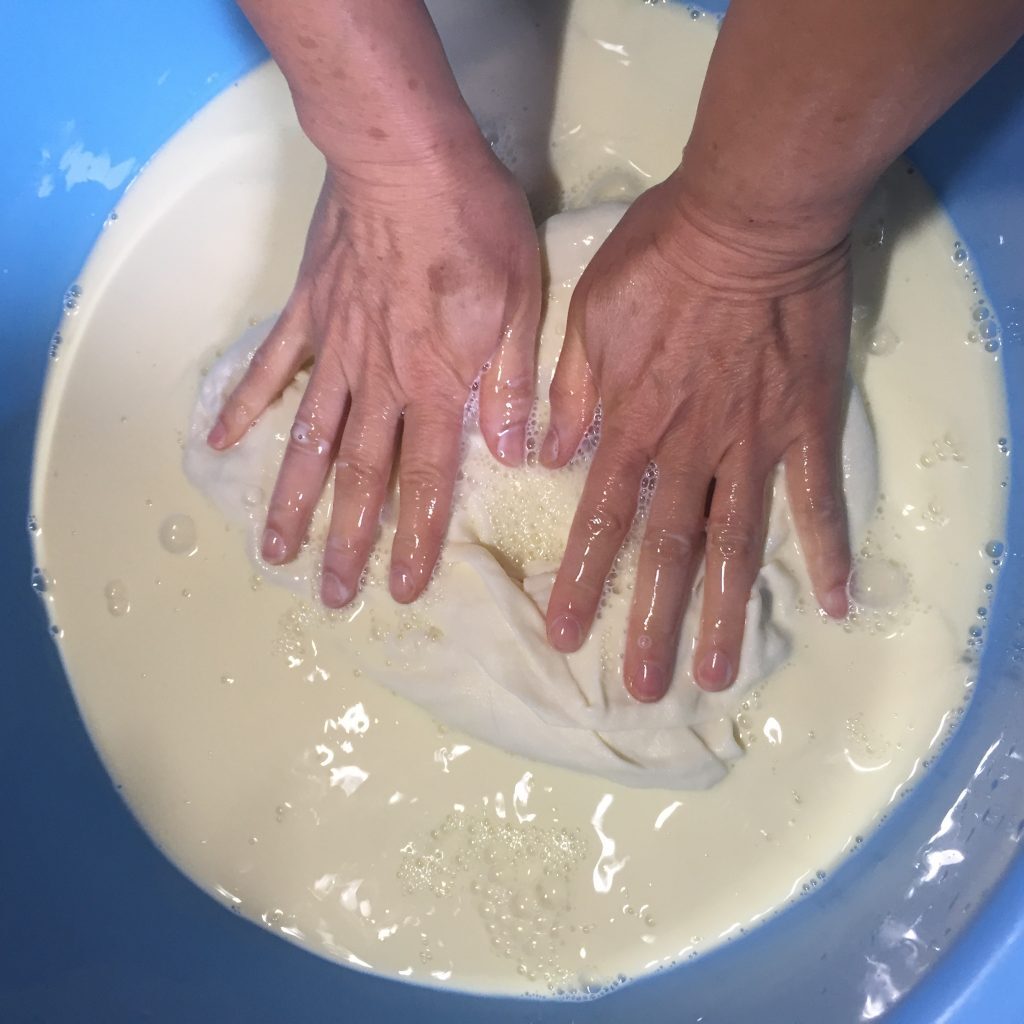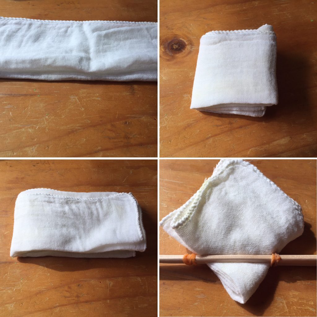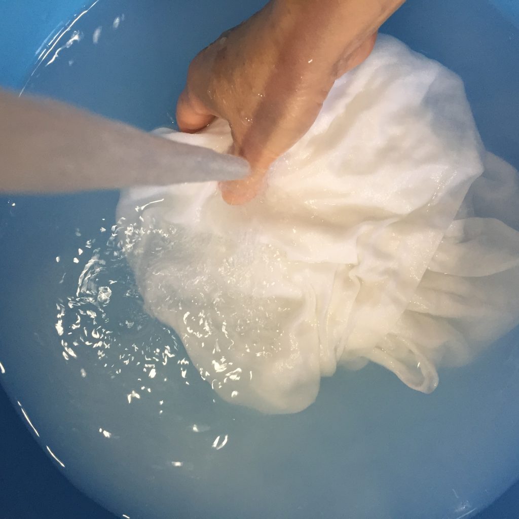木綿ガーゼを水洗いした後、助剤として豆乳をしみ込ませます。