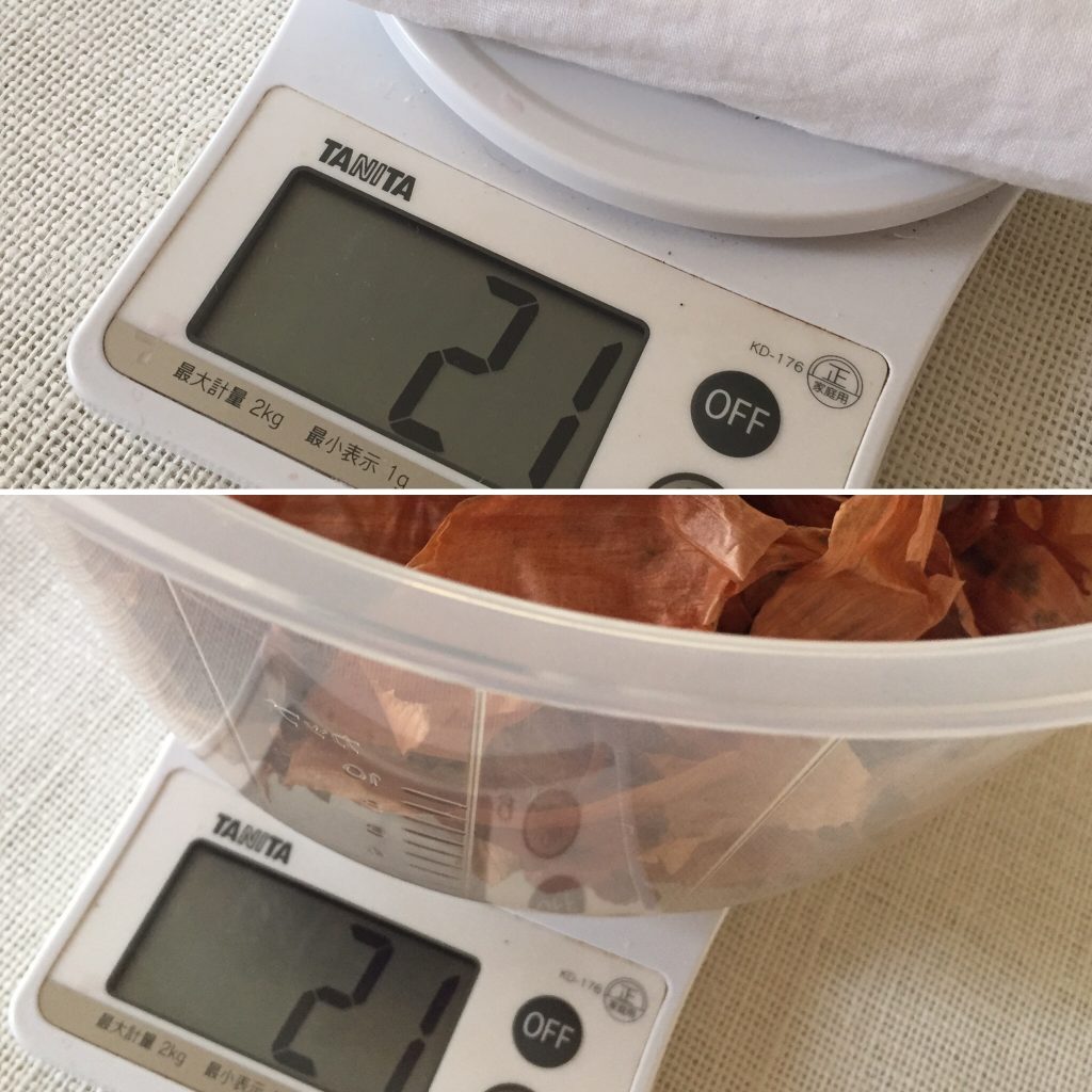 染めるガーぜの重さと同じ重さの玉ねぎの皮を用意。