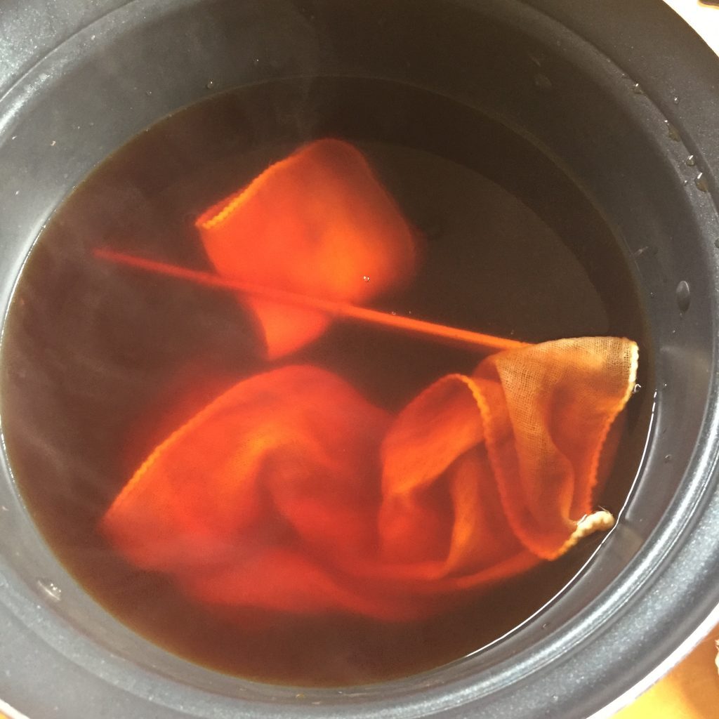 染めるものと同じ分量の材料を鍋にいれゆったりつかるくらいの水を入れる。