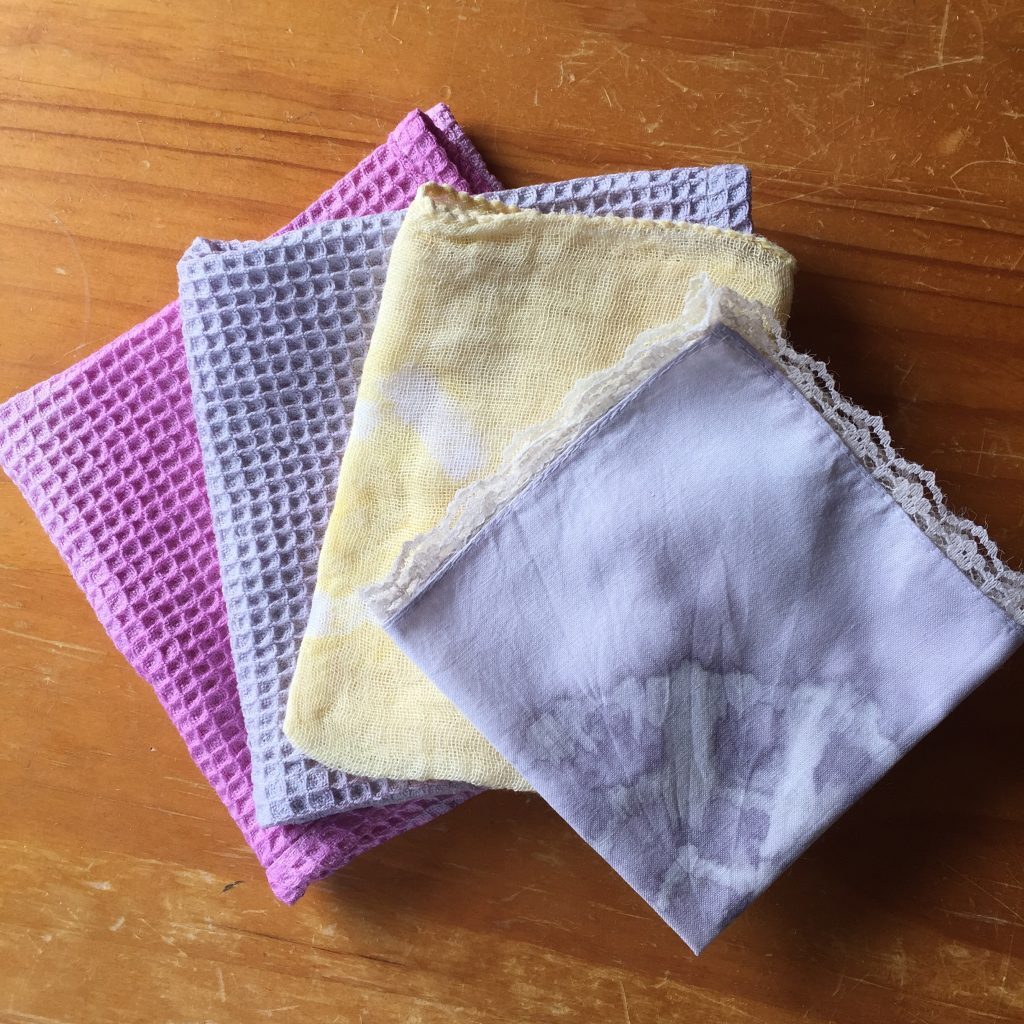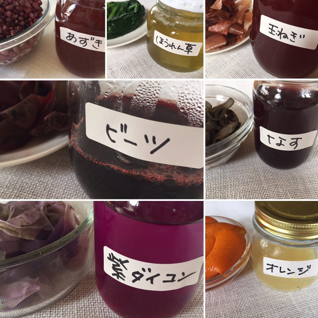 ※色だし用の野菜の皮などの量を多くしたりミョウバンやお酢の媒染液(ばいせんえき)を濃くしたり、うすめたりするとまた違う色合いになりますよ。