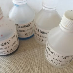 媒染液はたくさんの種類があり、今回友人から使いやすい薬品を分けてもらいました。