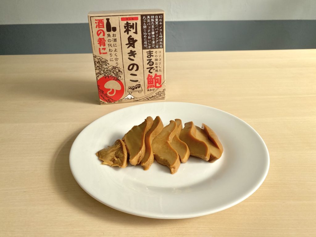 バイリング(あわび茸)を丸ごと一個たまり醤油漬けにしたもの。スライスしてご飯やお酒のお供に!メンマのような味わいと歯ごたえです。