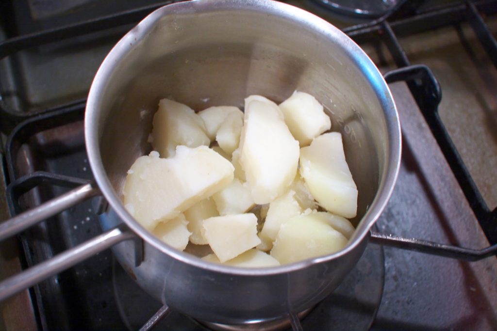 < 作り方> ジャガイモをやわらかく茹でて、水を切ります。今日はジャガイモ小2個使いました。実際にワンコに食べさせたのはケーキの半分なのでジャガイモも小さいものを一個分でしょうか。