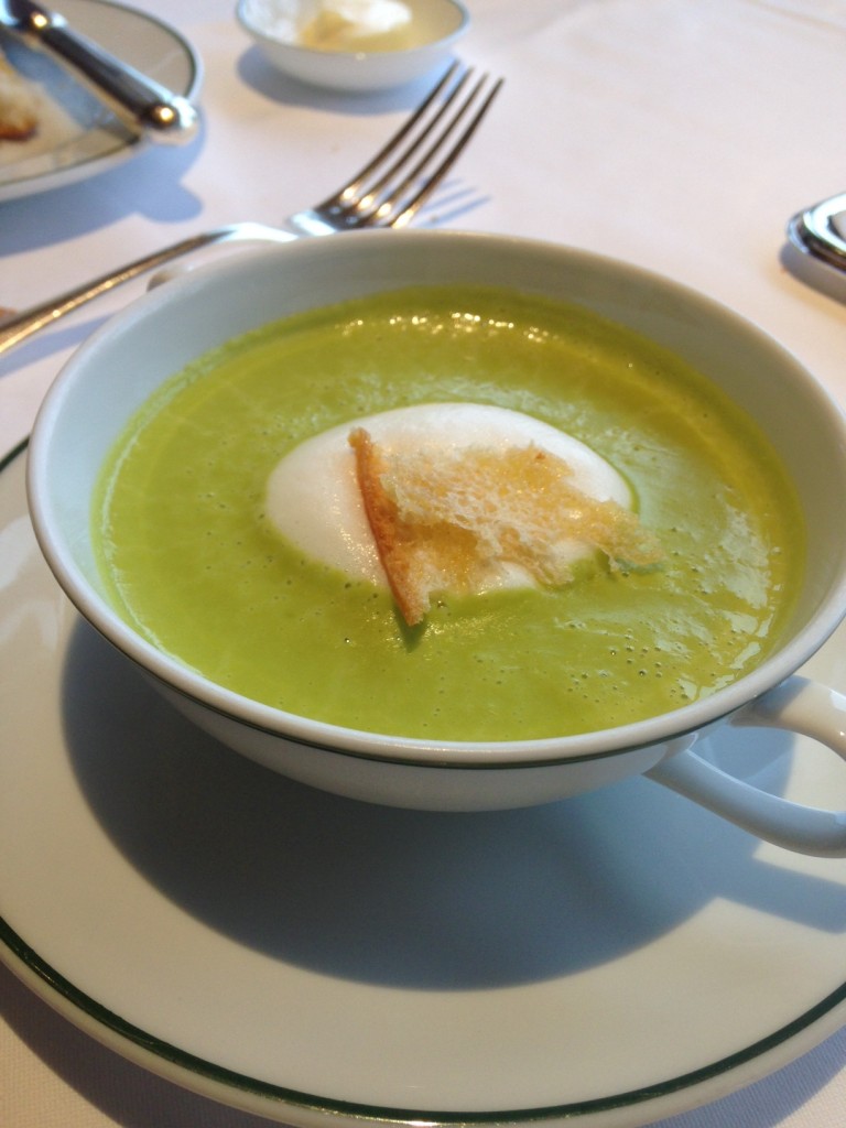 先日、ホテルでランチをいただく機会がありました。こちらはその時にいただいたグリーンピースのスープ。