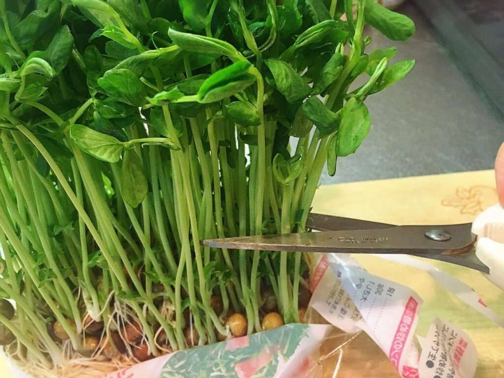 さて、本題! 豆苗で簡単に家庭菜園気分を味わおう〜 方法はとても簡単。葉と茎をカットして(食べて)