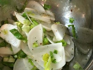 先日、ふと冷蔵庫を覗くと、あれ?カブ、1個だけ…。なぜか、ポツンと野菜室に…! なぜ、一つだけ残ってしまっていたのか?よく思い出せないのですが、まあ、よしとして…。 そんな時には、簡単にすぐできる!ちょっとつまめる前菜にしてしまいましょう! まずは、実は薄くスライス!大きいものは半月切りや銀杏切りにします。葉は小さめに小口切りにします。この時、より薄く、より小さく切った方が、味が染み込みやすく、出来上がりも早くなります。